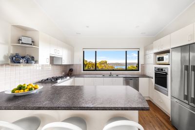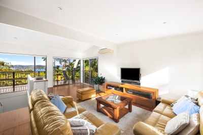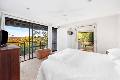The elevated setting offers panoramic views across the tree canopy to Pittwater and the ocean from the huge picture windows upstairs and down. Enjoy the direct level entry into the spacious open-plan lounge and dining area. Full of light, the floorplan flows effortlessly to a wraparound timber deck, perfect for alfresco dining.