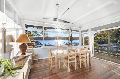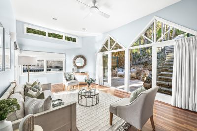 A much-loved weatherboard classic, the house has been architect designed. It offers two large living areas with hardwood floorboards. The main living area opens onto a huge north facing timber deck, Almost invisible from the street, there is an easy private driveway to generous undercover parking at the house. The master bedroom is huge and has an ensuite and walk-in robe. Almost every room opens onto a deck or patio that showcases all that life on Pittwater has to offer.